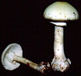Technical description (t.b.d.) BRIEF DESCRIPTION: The following is based in large part on the original description by Singer (1959b). The entire fruiting body of A. aestivalis, slowly stains some shade of red-brown to brown (because of bruising, cutting, age, etc.). The cap is 54 - 83 mm wide, entirely white with the occasional exception of pale tan or pale yellow over the center, and ranges from parabolic-obtuse at first to convex to planar as it matures. The margin is nonstriate or very short striate and not appendiculate; sometimes it flares upward in age. The volva is usually absent from the cap, but sometimes may be present at first in thin, submembranous patches. The gills are free, close, white, subventricose, moderately broad, and with slightly fimbriate edges. Form of short gills was not originally reported. The stipe 90 - 160 x 6 - 16 mm, white, cylindric or narrowing upward, usually without notable decoration, and stuffed. The stipe bears a white, superior, persistent annulus. There is a broad (up to 33 mm or more wide), rather abrupt, vertically cleft bulb at the stipe's base. This bulb is sometimes marginate (with a fragile, thin, raised rim 1- 10 mm high that is often obliterated during expansion of the fruiting body). The spores measure (5.8-) 7.0 - 9.5 (-10.9) x (5.0-) 6.8 - 8.8 (-10.5) µm and are globose to subglobose (occasionally broadly ellipsoid) and amyloid. Clamps are absent from bases of basidia. Singer stated the species occurred in forests of broad-leaved trees or in forests of such trees mixed with conifers. Among the associated trees, he listed beech, birch, fir, hemlock (Tsuga), oak, pine, and spruce. In my experience, the species is most commonly found in the northern hardwood-hemlock forests of the New England states in the USA, the southeastern provinces of Canada, and in the Appalachian mountain chain at least far enough south to include the Great Smoky Mountains National Park. The species was described from material collected in Massachusetts, Michigan, New York and Virginia, with the type taken from the Michigan material. Singer stated the species' range extended south to Florida. It is known from the eastern USA. Its segregation from A. asteropus Sabo ex Romagn. was demonstrated by Tulloss and Massart (1998). There is some question as to whether A. aestivalis is distinct from A. brunnescens G. F. Atk. Singer claimed that bruising/staining occurred more rapidly in A. brunnescens and that the radial lines of pigment often seen on the cap of the latter species are not ever to be found in A. aestivalis. -- R. E. Tulloss Photo: R. E. Tulloss (northeastern U.S.A.)