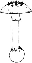 Technical description (t.b.d.) BRIEF DESCRIPTION: Amanita morenoi is a poorly known species. It has a cap 45 - 63 mm wide as dried, pale brown to sordid chestnut brown when fresh, polished, convex when young, and planar in age. The cap margin is apparently nonstriate at first, then short tuberculate-striate. The volva appears on the cap as warts, densest over disc, large, thick, subpyramidal to conical, crowded, brown, and pulverulent. The gills of this species are free or narrowly adnate, rather close, and cream to white. The short gills are truncate to subtruncate to rounded truncate with attenuate tooth and apparently sparse. The stem is 68 - 71 x 8 - 10 mm as dried and cream when fresh; and the stem's bulb is 15 - 20 x 14 - 16 mm as dried, possibly subglobose or even subabrupt when fresh; and is hollow as dried in some specimen. There is an membranous, superior, skirt-like annulus that collapses on the stipe. On the stipe the volva is pulverulent brown to chestnut brown and forms scales and warts on lower stipe and the top of the bulb, sometimes warts may be in a ring. Odor and taste were not recorded for this species as far as we know. The spores of this species measure (8.4-) 8.8 - 12.2 (-19.6) x (7.0-) 7.5 - 10.5 (-15.4) µm and are subglobose to broadly ellipsoid to ellipsoid (or infrequently globose) and inamyloid. Clamps are rather common at the bases of basidia. Amanita morenoi has been found only in Argentina in the area of Lago Espejo in Parque Nacional Nahuel Huapí, in March. If there is a very similar taxon (none are known, the common clamps suggest a possible relationship to the A. muscaria-group), that entity probably also occurs only in the Southern Hemisphere. Specimens of this species have been misdetermined as A. umbrinella E.-J. Gilbert & Cleland, which is a very dark-capped Australian taxon. The species may be toxic and likely to produce symptoms similar to those of A. muscaria (L. : Fr.) Lam. and A. pantherina (DC. : Fr.) Krombh. -- R. E. Tulloss Schematic drawing based on original description and dried type specimen: R. E. Tulloss [ Section Amanita page. ] [ Amanita Studies home. ] [ Keys & Checklist/Picturebooks ] Last changed 10 October 2009. |