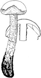 Technical description (t.b.d.) BRIEF DESCRIPTION: Like many species of Amanita section Amidella, A. neoovoidea has more than one distinct volval layer. Below the firm, yellowish or tannish membranous layer (commonly left on the cap as a calyptra) is a powdery layer. The cap is 75 - 130+ mm wide, white or off-white becoming golden blonde in age, and hemispheric at first becoming planoconvex or depressed in age. The flesh is unchanging when cut or bruised. The gills are pale cream to white, sometimes with a faint rosy tint, free with a decurrent line on the upper stem, and up to 7 - 10 mm broad. Short gills are frequent and rounded attenuate. The stipe is 110 - 130 x 12 - 15 mm, white, becoming sordid on handling, and flocculose or floccose-squamulose. Its flesh is white. A white annulus is present and is apical to superior, floccose-subfelted, friable, and often disappearing. The base of the stem is often inserted rather deeply in the soil (sometimes radicating). The volva is saccate, membranous, and colored as on the cap or more orangish. The appearance of a bulb is due to the robustness of the volval sack. The odor of this species is reportedly penetrating, but not unpleasant; and the taste is mild. The spores measure (5.8-) 6.8 - 9.8 (-12.0) x (4.2-) 4.8 - 6.5 (-7.5) µm and are amyloid and broadly ellipsoid to ellipsoid (occasionally elongate, rarely cylindric). Clamps are not present at bases of basidia. This species is edible and eaten in a variety of preparations in Japan (for example, as tempura or in soups). Because of this fact, reports that it contains the same kidney toxin as Amanita smithiana Bas (section Lepidella) may require reinvestigation. The type species of section Amidella, A. volvata (Peck) Lloyd, as well as other North American, European, and east Asian taxa (e.g., A. avellaneosquamosa (S. Imai) S. Imai and A. clarisquamosa (S. Imai) E.-J. Gilbert) of section Amidella, have flesh that will often turn pink when cut or bruised. Moreover, old wounds and powdery remnants of the volval often become brown or reddish brown in age in these species. Amanita neoovoidea lacks these two characters. A distinctive odor is also not commonly reported for taxa of the section. The species most similar to A. neoovoidea are A. ovoidea (Bull. : Fr.) Link and A. proxima Dumée. The species was originally described from Japan. It is also known from China and Nepal. Yang (1997) provides the most recent taxonomic description of this species. -- R. E. Tulloss Photos: David Arora (2nd through 4th rows, Yunnan Province, China); Zhu L. Yang (1st row, southwestern China) [ Section Amidella page. ] [ Amanita Studies home. ] [ Keys & Checklist/Picturebooks ] Last change 10 October 2009. |