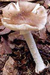 Technical description (t.b.d.) BRIEF DESCRIPTION: Fruiting bodies of Amanita pseudoporphyria are medium-sized to large, sometimes very large. The cap is 50 - 150 mm wide, convex to applanate, greyish to grey to grey-brown, darker in the center, innately fibrillose, and glabrous or covered with a few white to dirty white, membranous volval remnants; the cap's margin is smooth and non-appendiculate, but often with annulus remnants hanging on the margin; the cap's flesh is white. The gills are free to subfree and white; the short gills are attenuate. The stem is 80 - 130 x 5 - 20 (-40) mm, subcylindric to attenuate upwards, with a surface that is white and covered with white fibrillose to farinose squamules; the flesh is white; the stem's basal bulb is 10 - 30 (-50) mm wide, ventricose to fusiform, and often somewhat rooting. On the stem's base, the volva is limbate, with a free limb up to 50 cm high. The volva's outer surface is white to dirty white, occasionally greyish, while the inner surface is white. The annulus is apical to subapical, white, fragile, and fugacious or persistent. Basidiospores (6.0-) 7.0 - 9.0 (-10.5) x (4.5-) 5.0 - 6.5 (-7.5) µm, broadly ellipsoid to ellipsoid, amyloid. Clamps are absent from the bases of basidia. This species was originally described from Japan. It is very common and widely distributed in China and often sold, together with A. manginiana sensu W. F. Chiu, in free markets. Amanita pseudoporphyria is very similar to A. manginiana sensu W. F. Chiu, but differs from the latter mainly by its broad ellipsoid to ellipsoid spores and more abundant inflated cells in the volva. Amanita indica R. P. Bhatt, Locq. & T. N. Lakh. may be synonymous with A. pseudoporphyria. -- Zhu L. Yang This species is now known from northern India, Nepal, and Thailand in addition to southern China and Japan. -- R. E. Tulloss Photos: Zhu L. Yang (Hunan Province, China) [ Section Phalloideae page. ] [ Amanita Studies home. ] [ Keys & Checklist/Picturebooks ] Last change 5 August 2008. |