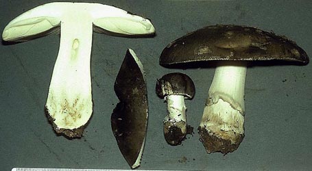 Technical description (t.b.d.) BRIEF DESCRIPTION: The following is largely based on the original description (1941). The cap of Amanita umbrinella is around 75 mm wide, hemispheric at first, convex becoming planar, center becoming depressed, viscid to dry with a lightly striate margin that is sometimes not apparent at first. The cap can range from grayish brown to saturated olive-chestnut, bistre, very dark umber, chocolate, drab hair brown, or olivaceous-black. The volval remnants on the cap are grayish-white warts sparsely distributed or, occasionally, as a single patch (white at first and graying). Gills are rather crowded, very close to the stem or even attached to it, white or very pale cream colored, often becoming pinkish, and, in dried material, sometimes becoming purplish. The short gills are numerous, squarely truncate, and sometimes seeming to reflect a purplish tint. The stem is about 75 ×15 mm, narrowing upward, with a fibrillose surface. The stem may be more pallid than the cap, but the basal part will often be distinctly gray or gray-brown. The bulb is 25 mm wide and is pronounced or marginate or neither. When the bulb is not clearly defined, the stipe base is sometimes pointed. On the bulb's border, there is a limbate volva which is submembranous to friable and often falling away. The ring is membranous, ample, and persistent. It's white to somewhat sordid and finely striate above. The spores measure approximately 11.5 - 13 × 9 - 11.5 µm. Presence or absence of clamps on bases of basidia not known. Its author reports that spores were not found in the original material of A. bambra Grgur. Wood (1997) presents a confusing picture on basidial clamps in this species indicating that they can be present and not rare in some cases as well as absent in others. Moreover, he applies the name umbrinella to a taxon with pale pigments. Considering the phenetic similarity of the present species with taxa bearing plentiful clamps, I'm inclined A. umbrinella will be found to bear clamps on its basidia. Very often one can get a small sample of spore size and shape from the illustrations of Gilbert (1941). In the case of A. umbrinella, there is so much variation in the spore shapes drawn for the species that we have chosen only to use the information from the holotype and one paratype (called syntype by Gilbert). Among these only four were presented in lateral view; and (as is our usual microscopic procedure) these were the only spores on which we took data. The resulting measurements yield 11.5 -14 × 8.8 - 9.8 µm and are ellipsoid. This species is originally described from the state of South Australia where it was found in sandy soil. Reid (1980) cites reports of its presence in the states of Victoria and West Australia. The authors indicated no nearby tree species. Amanita umbrinella is also reported from New South Wales with Eucalyptus. The dark shades of brown and gray in the cap, the submembranous grayish limb of the volva, large spore size, a ring that sometimes is lost, all strongly suggest a group of species probably related to (or even synonymous with) Amanita merxmuelleri Bresinsky & Garrido described from Nothofagus forests in Argentina and Chile. Further examination of the potential relationship could be very helpful in understanding the dispersal of formerly Gondwanan mycota. Amanita murinoflammeum Tulloss, A. M. Young & A. E. Wood was originally described as belonging to section Vaginatae; however, further study shows it to be somewhat similar to A. umbrinella in macromorphology. Photographs or careful drawings of sections of buttons of this and possibly related taxa will be valuable in understanding their morphological taxonomy. -- R. E. Tulloss and L. Possiel Photo by Heino Lepp (Australia).